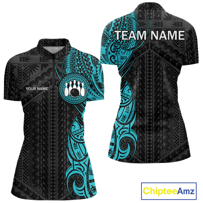 Black & Cyan Blue Tribal pattern Women Bowling Shirt Custom Bowling outfit ladies Team bowling jersey NQS10649