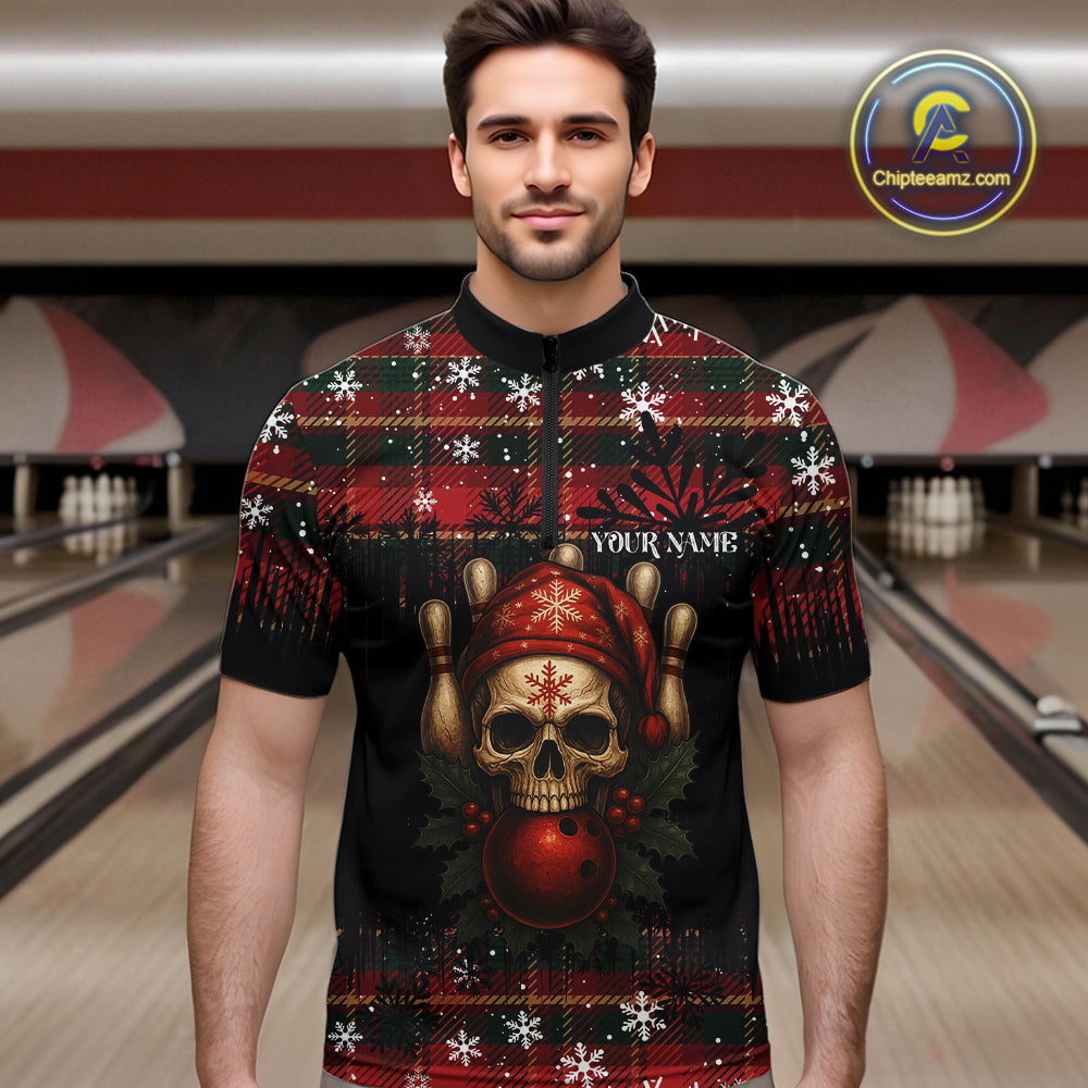 Black & Red Plaid Christmas pattern Skull Bowling Shirts For Men Custom Team Bowling outfit jerseys NQS11057
