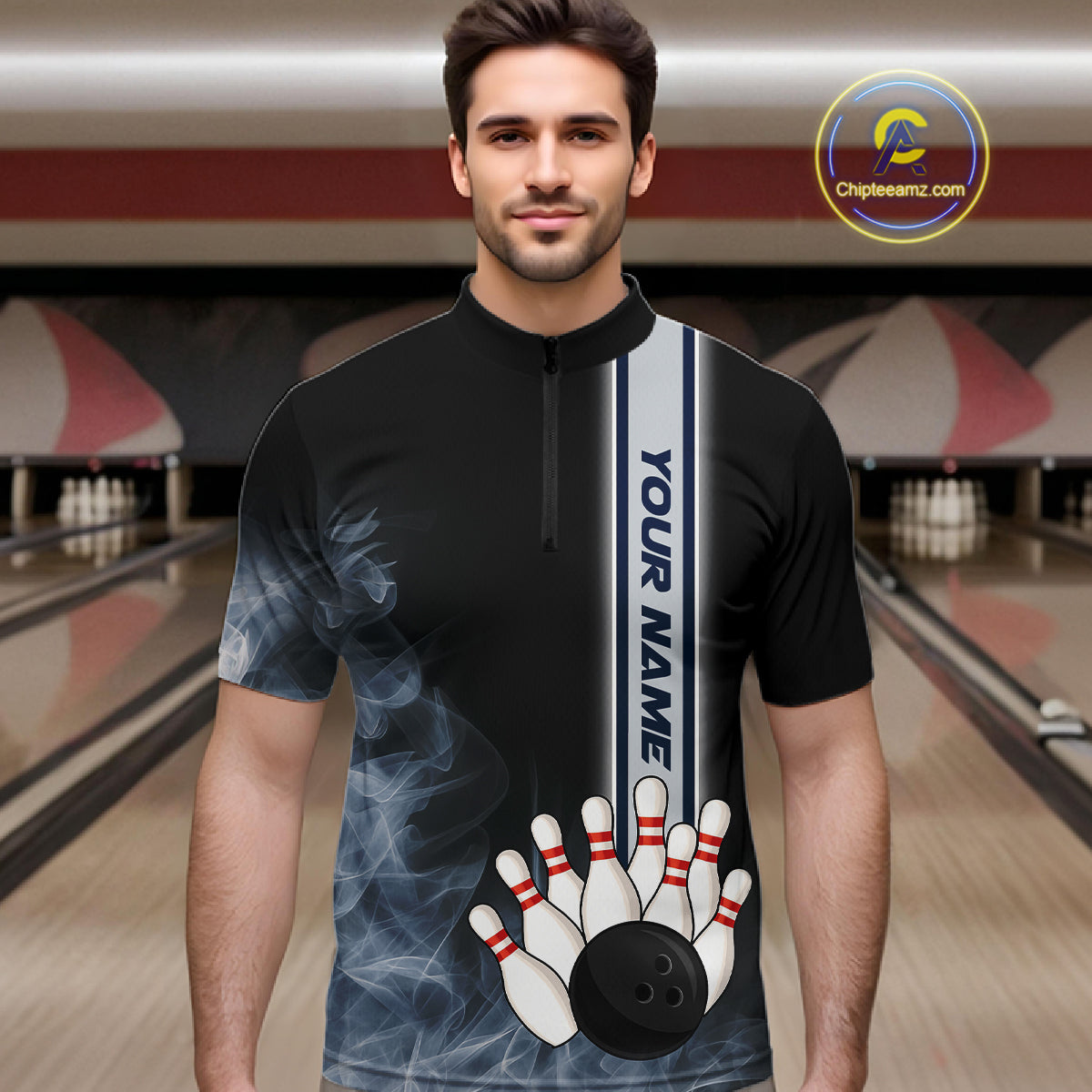 Black Smoke Bowling Polo, Quarter Zip Shirts For Men Custom Team Bowling Tournament Jerseys NQS10681
