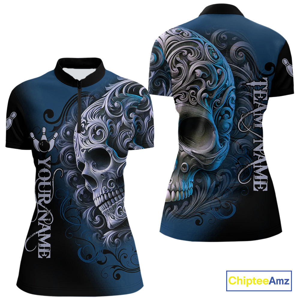 Blue and Black Skull Scroll Women Bowling Polo, Quarter Zip Shirts Custom Skull Team bowling Jersey NQS10939