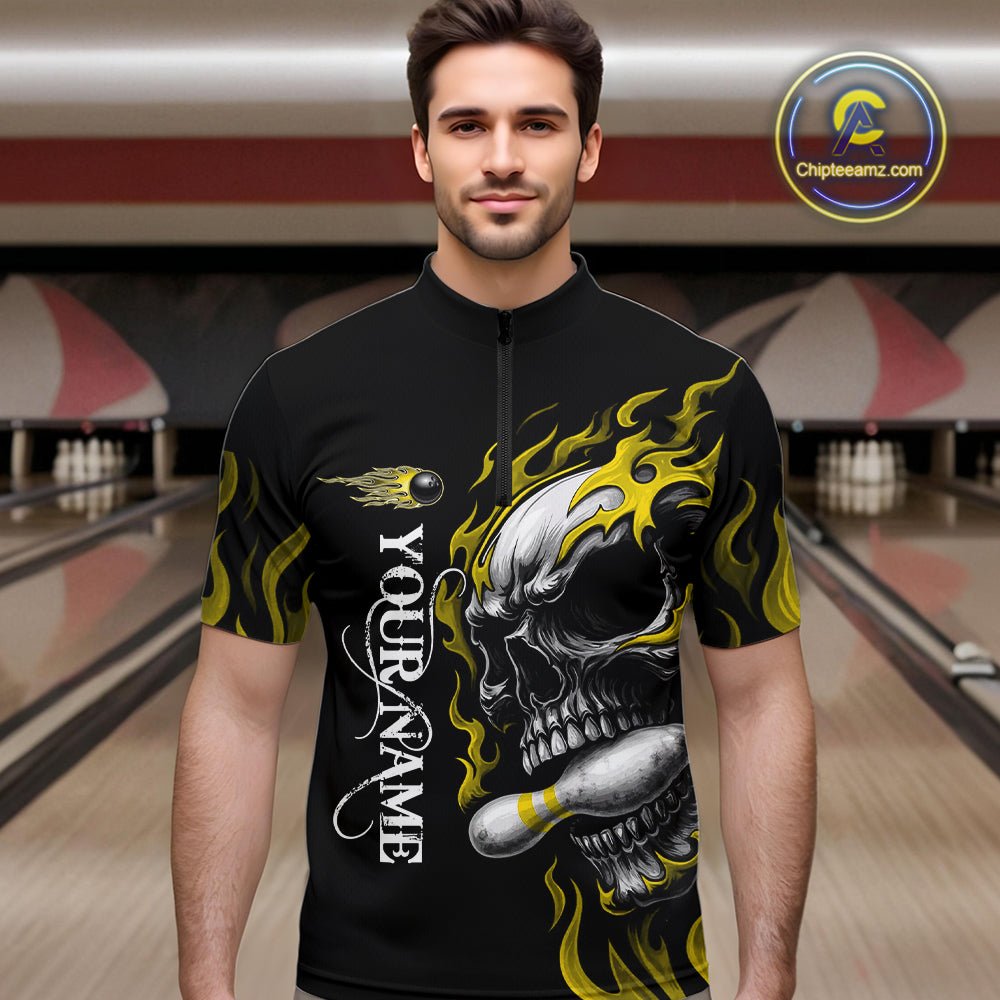 Custom Black and Gold Flame Skull Bowling Shirts For Men, Personalized Skull Team Bowling Jersey NQS10795