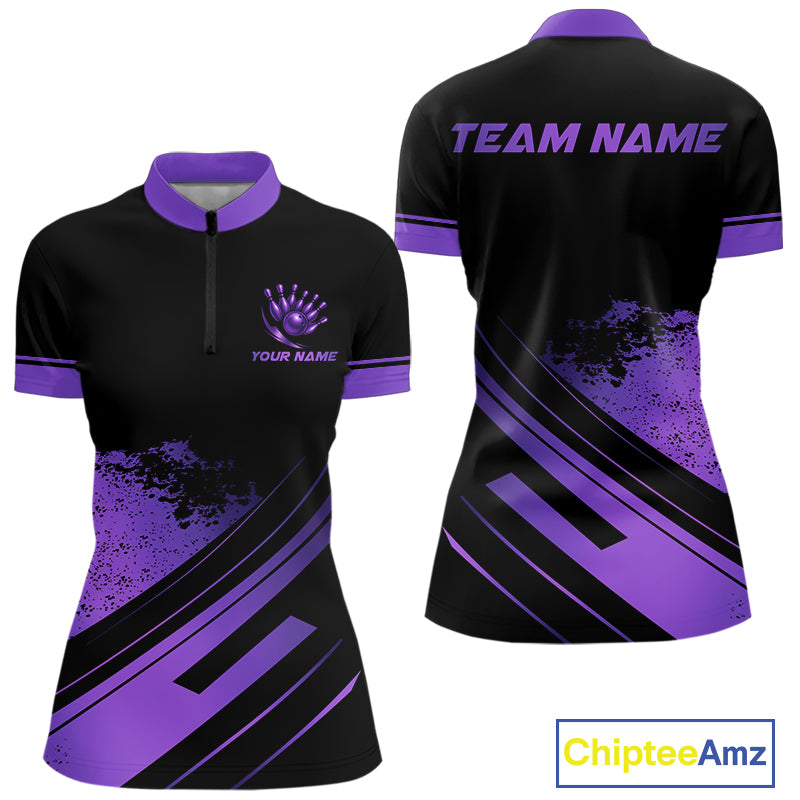 Custom Black And Purple Bowling Team Polo, Quarter-Zip Shirts For Women, Personalized Bowling Jerseys NQS10541