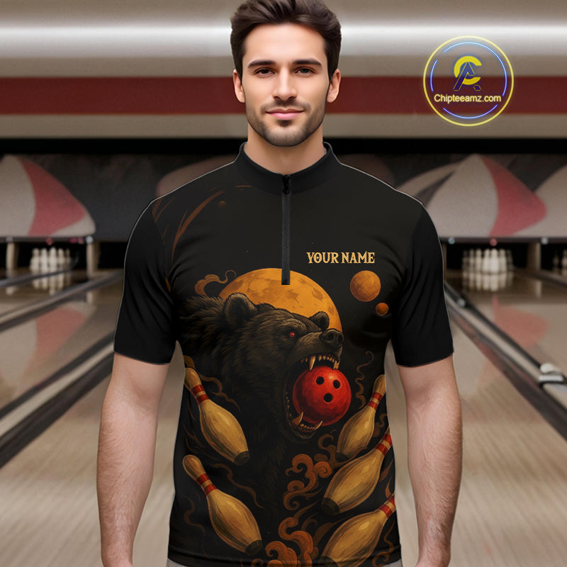Custom Black Bear Bowling Men Polo, Quarter Zip Shirts Bear Bowling Team Jerseys NQS10781