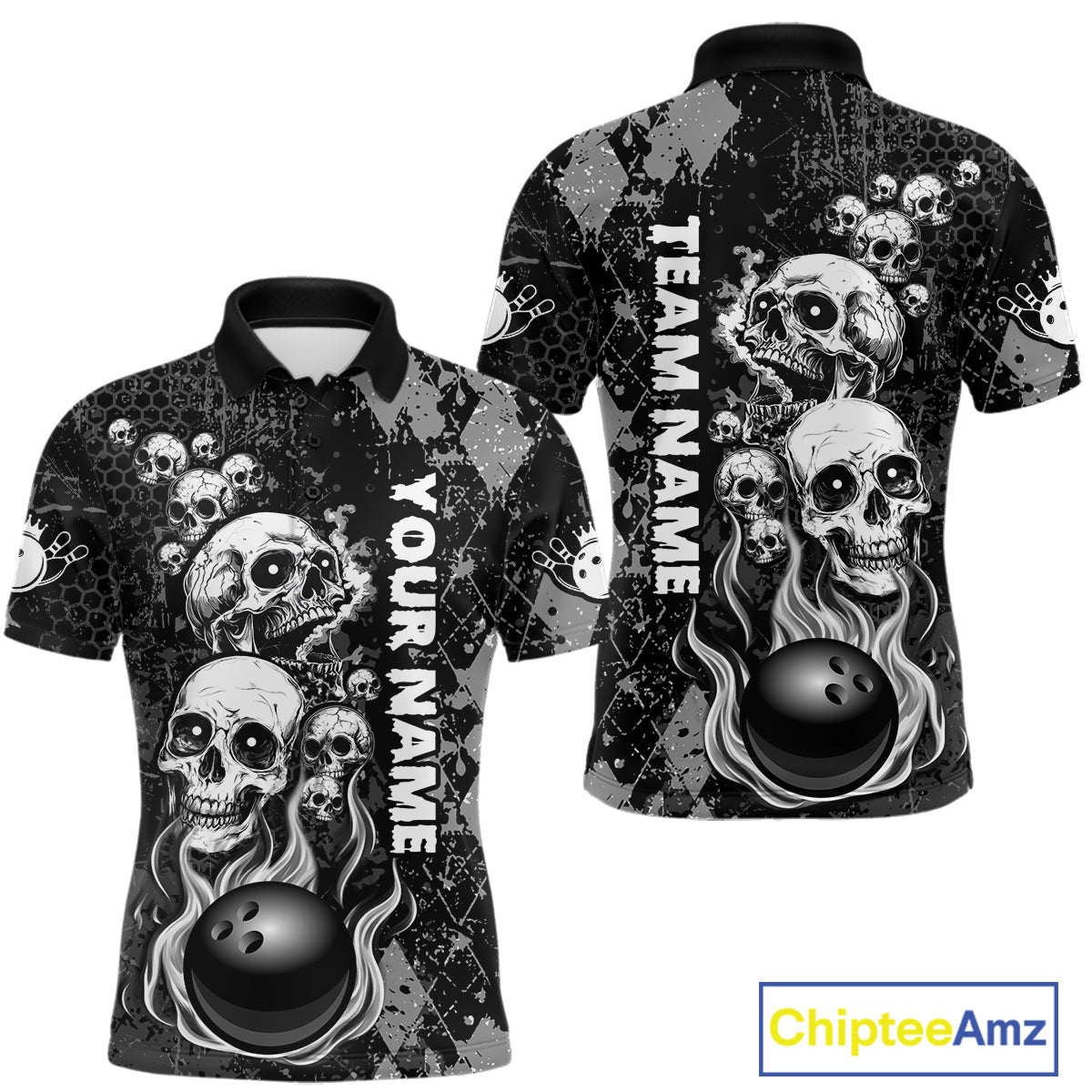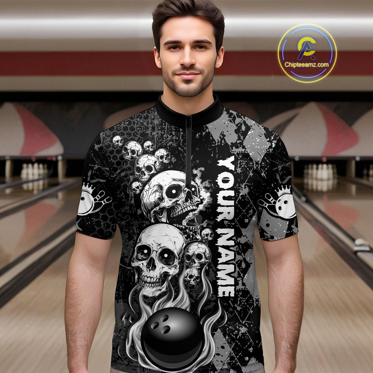 Black Grey Grunge Argyle Skull Bowling Shirt For Men Custom Bowling Team Jersey Polo & 1/4 Zip TDM4773