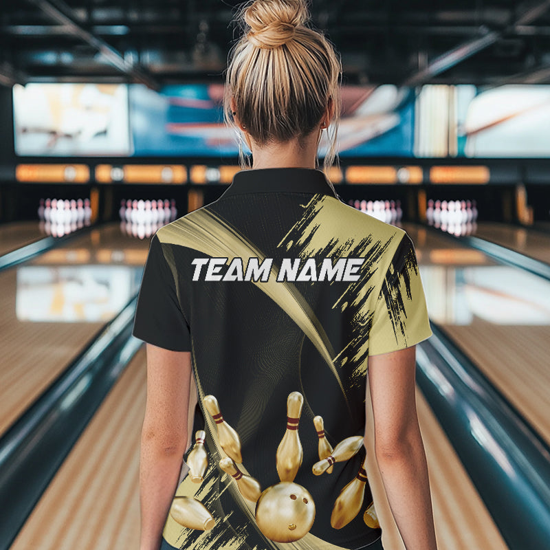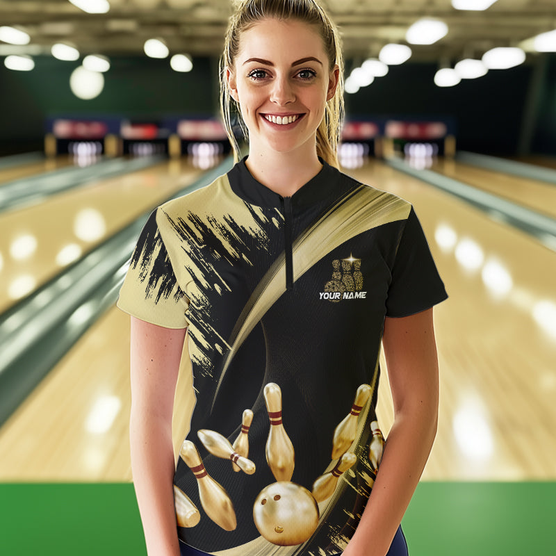 Personalized Black and Gold Bowling Polo, Quarter Zip Shirts For Women Custom Bowling Team Jersey NQS9531
