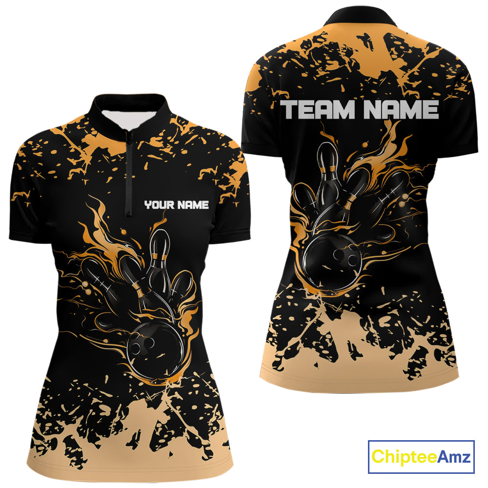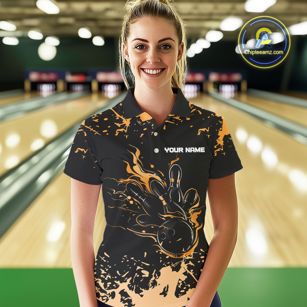 Personalized Black and Orange Bowling Shirts For Women, Bowling Balls And Pins Bowling Team Shirts NQS10743