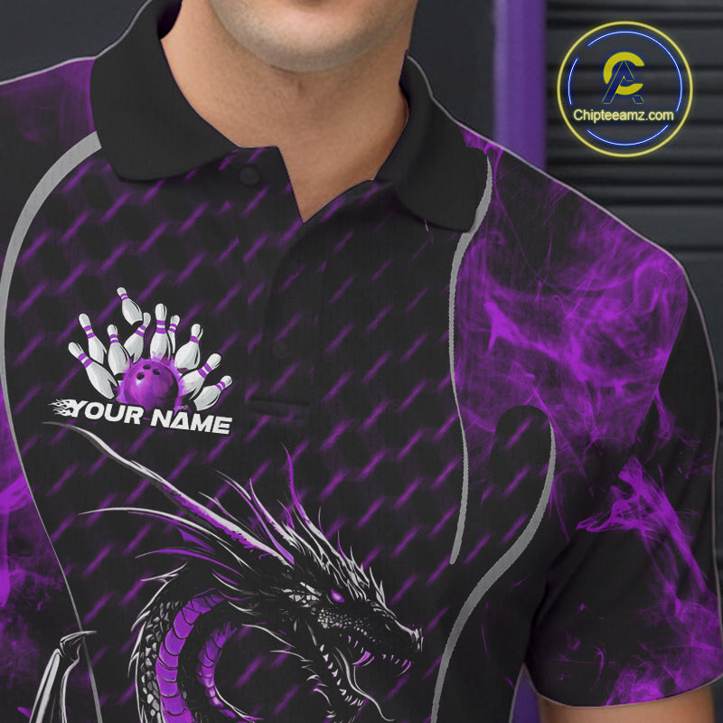 Custom Black And Purple Fire Flame Dragon Bowling Men Polo Shirt, Dragon Bowling Jersey IPHW9865
