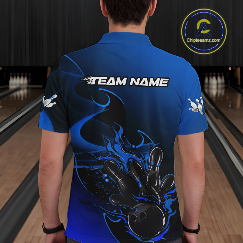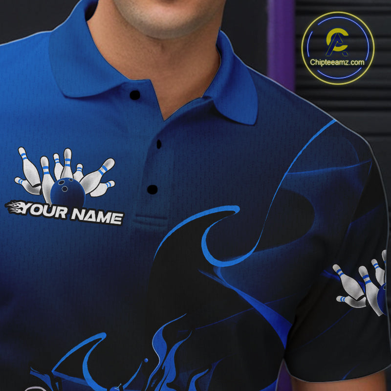 Custom Black And Blue Flame Bowling Team Men Polo Shirt, Bowling Tournament Shirt IPHW9871