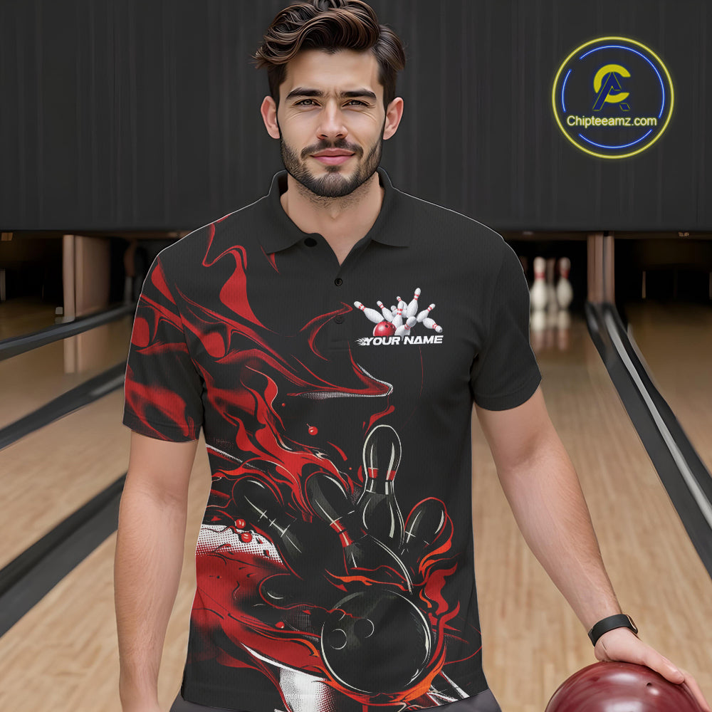 Custom Black And Red Camo Flame Bowling Team Polo Shirts For Men, Bowling Jerseys IPHW9877