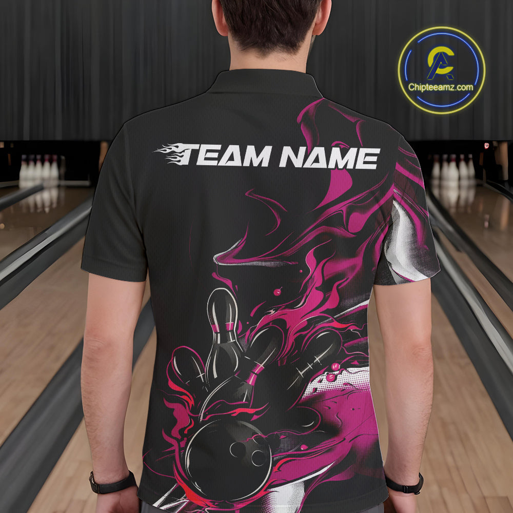 Custom Black And Pink Camo Flame Bowling Team Polo Shirts For Men, Bowling Jerseys IPHW9880