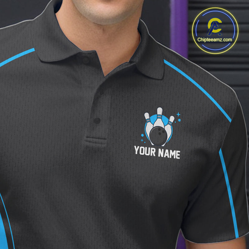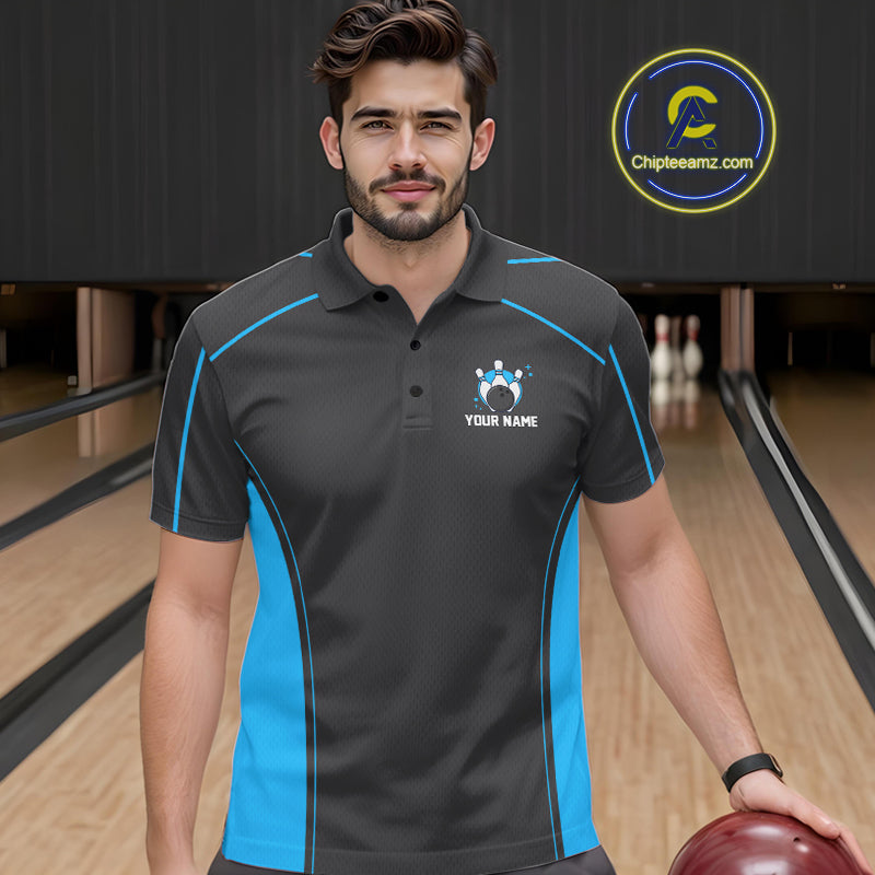 Custom Black And Ball Blue Classic Bowling Team Polo Shirt For Men, Bowling League Shirt IPHW9911