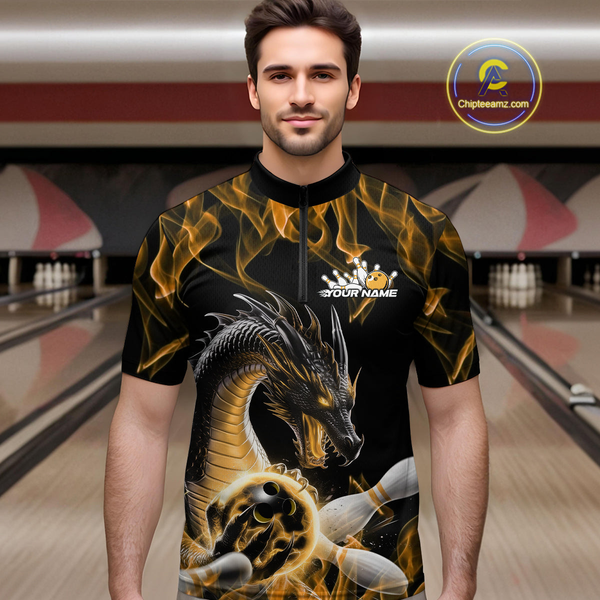 Custom Black And Gold Fire Flame Dragon Bowling Quarter-Zip Shirt For Men, Dragon Bowling Jersey IPHW9824
