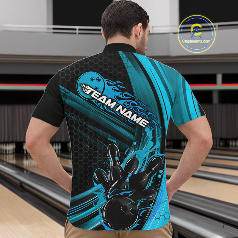 Custom Black And Blue Flame Bowling Jerseys, Bowling Team Quarter-Zip Shirts For Men IPHW9885