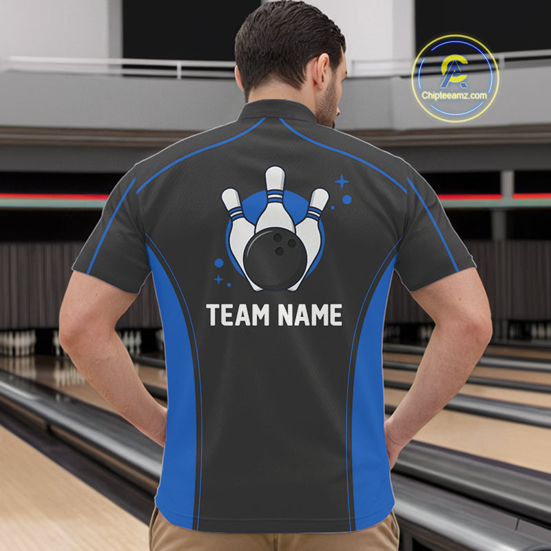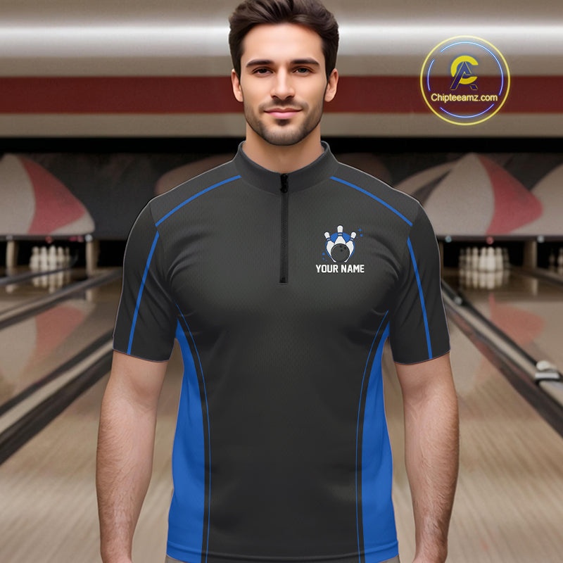 Custom Black And Mid Blue Classic Bowling Team Quarter-Zip Shirt For Men, Bowling League Shirt IPHW9912