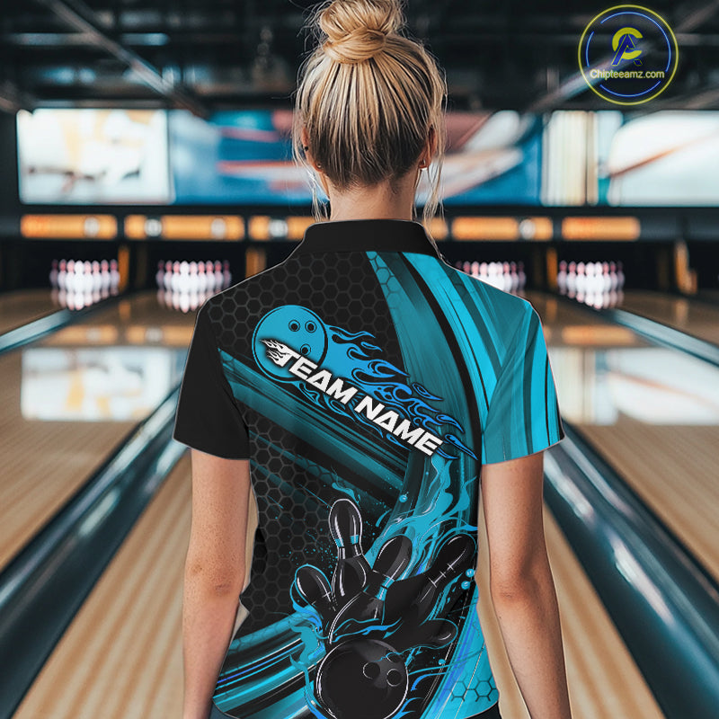 Custom Black And Blue Flame Bowling Jerseys, Bowling Team Quarter-Zip Shirts For Women IPHW9885