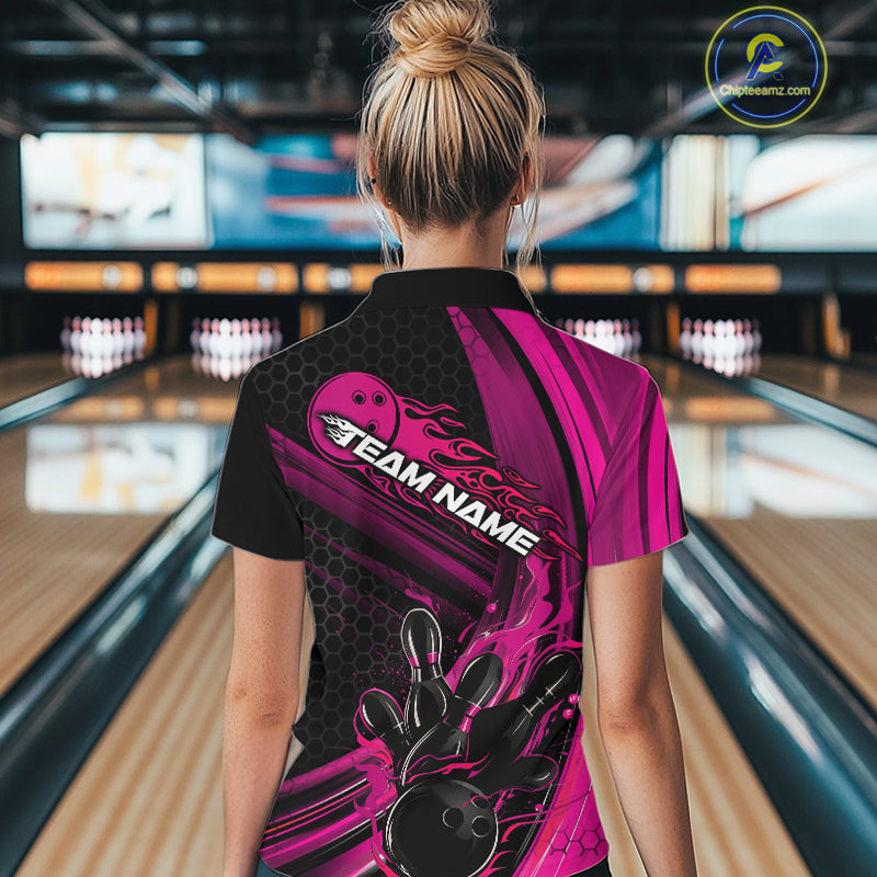Custom Black And Pink Flame Bowling Jerseys, Bowling Team Quarter-Zip Shirts For Women IPHW9886