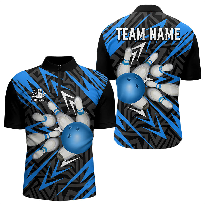Black and Blue Camo Bowling Polo, Quarter Zip Shirt for Men Custom Team bowling jerseys Bowler Outfit NQS9177
