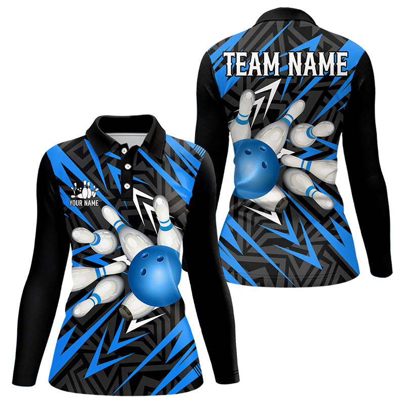 Black and Blue Camo Bowling Polo, Quarter Zip Shirt for Women Custom Team bowling jersey Bowler Outfit NQS9177