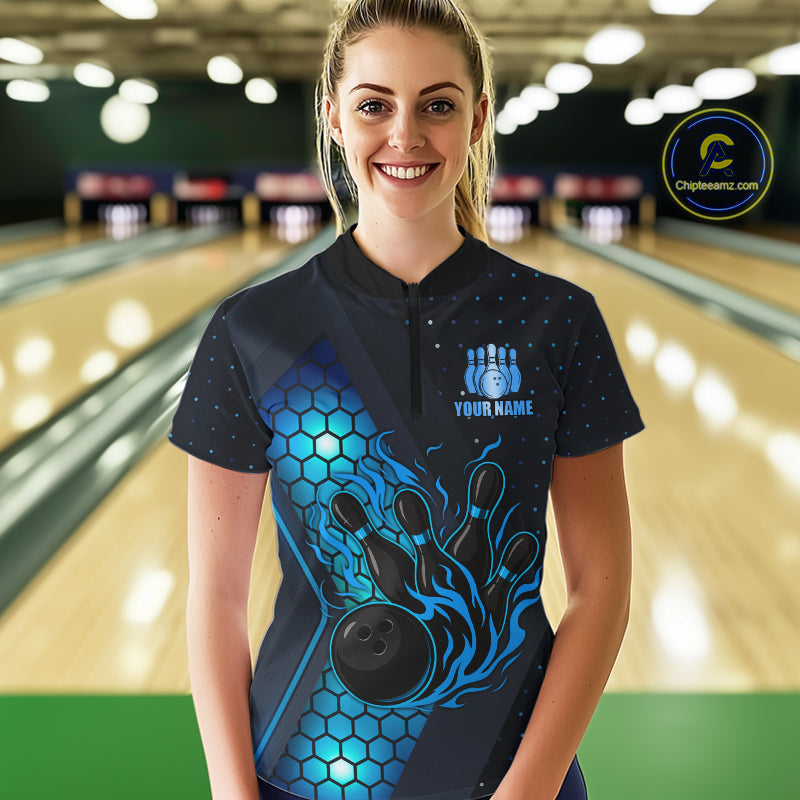 Black and Blue Flame Bowling Polo, 1/4 Zip Shirts for Women Custom Bowling Team Jersey Bowler Outfit NQS10925