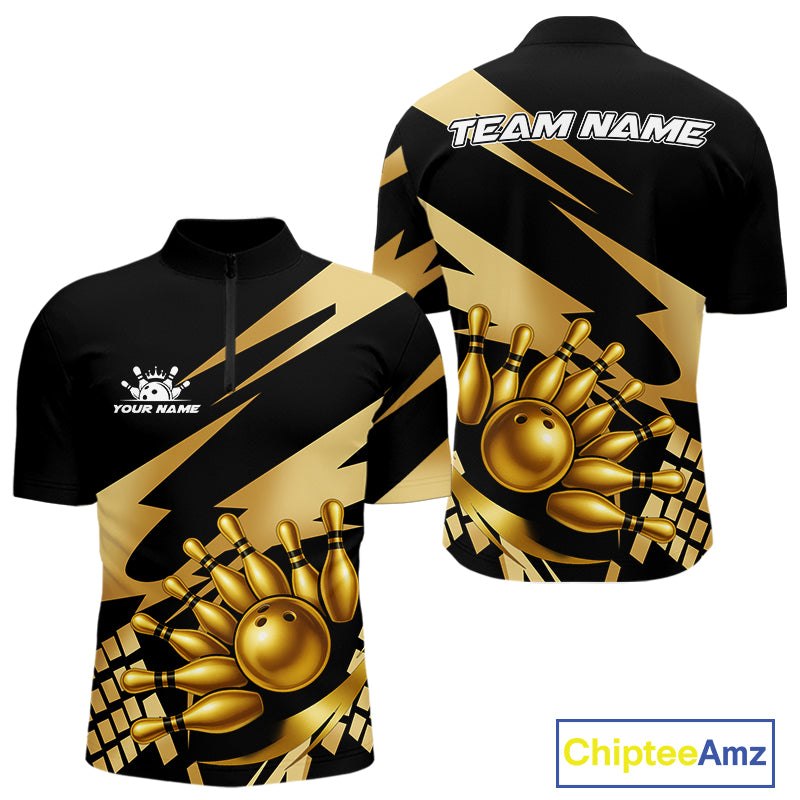 Black and Gold Bowling Polo, Quarter Zip Shirts For Men Custom Team bowling jerseys, gift for bowlers NQS11069