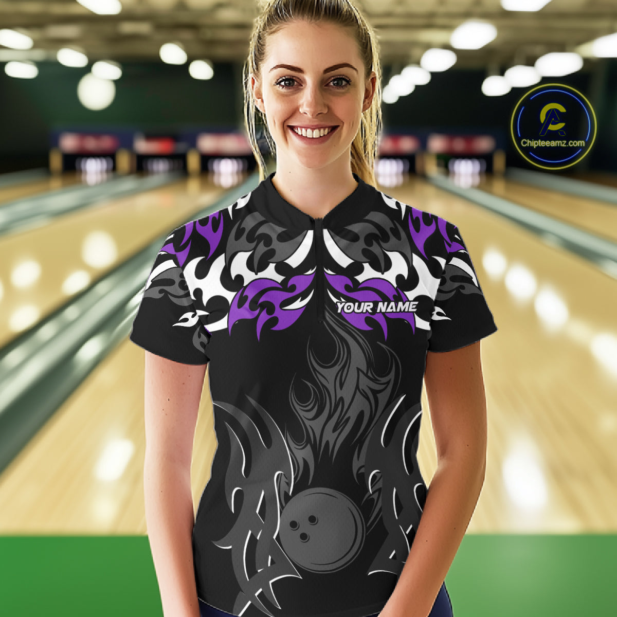 Black and Purple Flame Bowling Polo, 1/4 Zip shirt for Women Custom Team bowling jersey bowler gift NQS10535