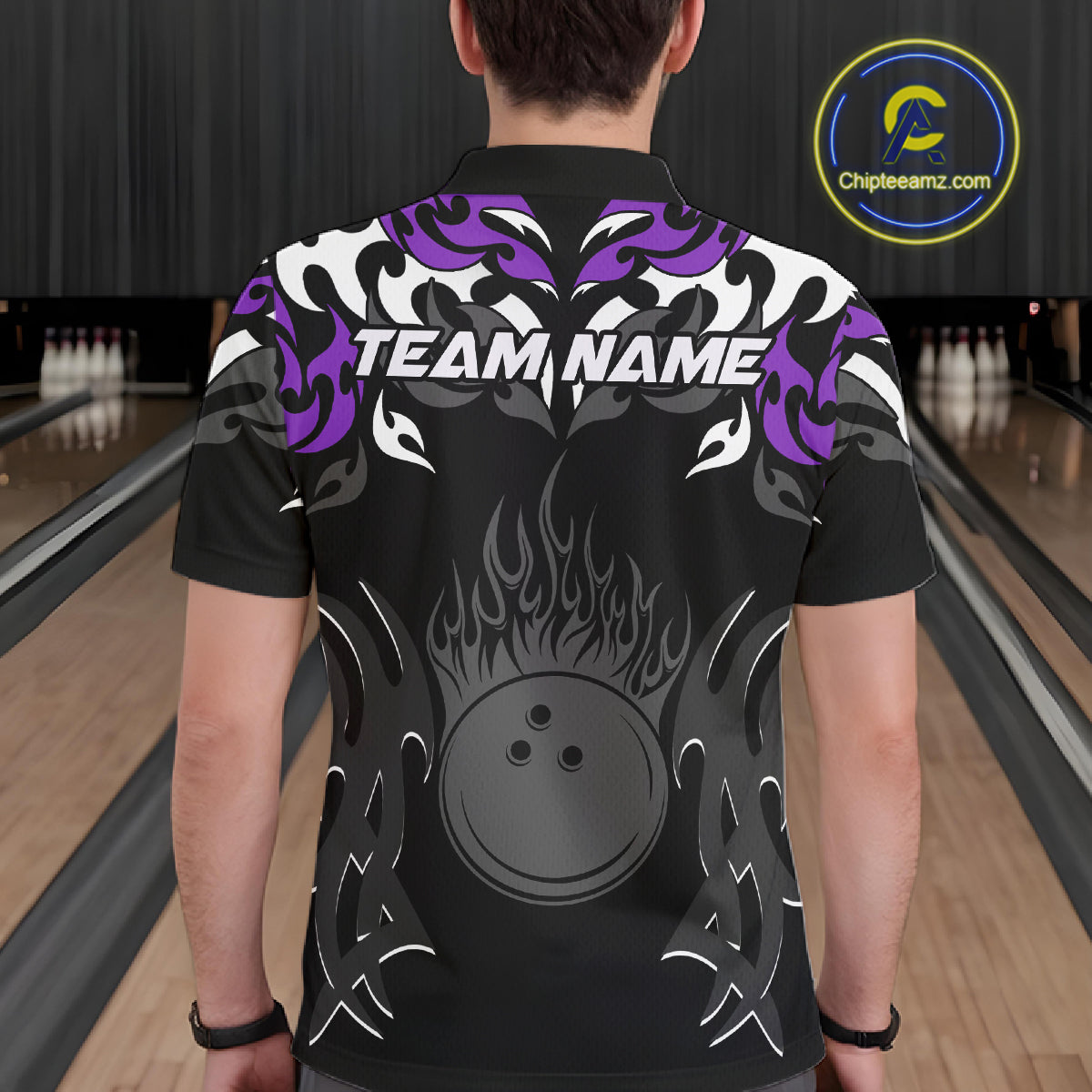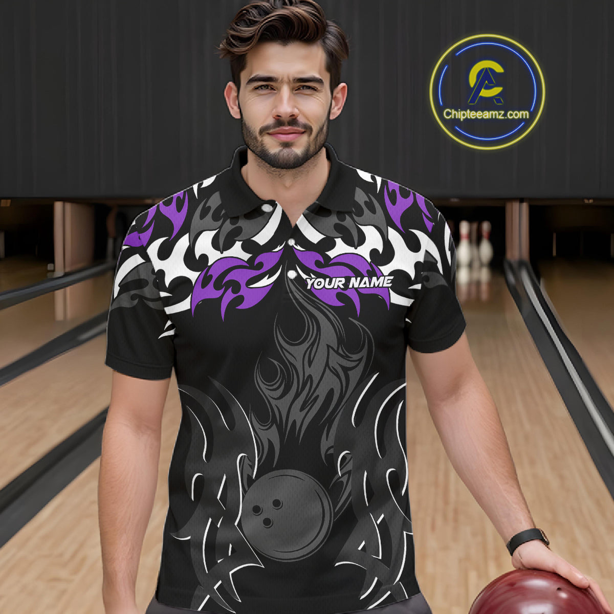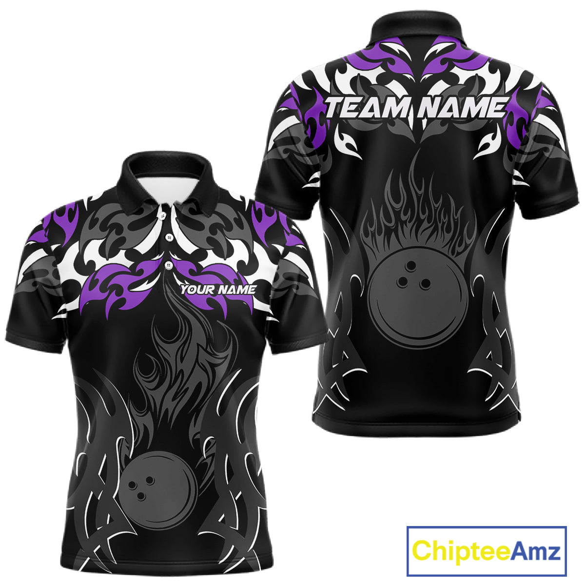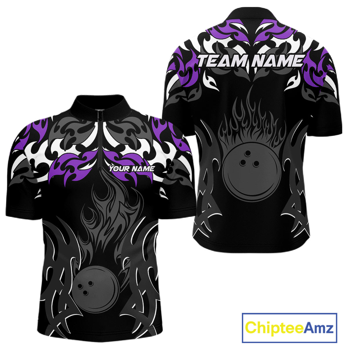 Black and Purple Flame Bowling Polo, Quarter Zip shirt for men Custom Team bowling jersey bowler gift NQS10535