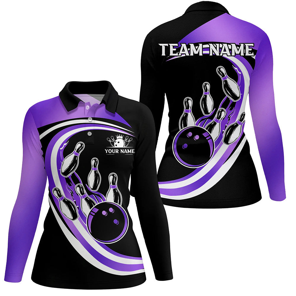 Black & Purple Bowling Polo, 1/4 Zip Shirt For Women Custom Bowling Team League Jersey,Gift For Bowler NQS9044