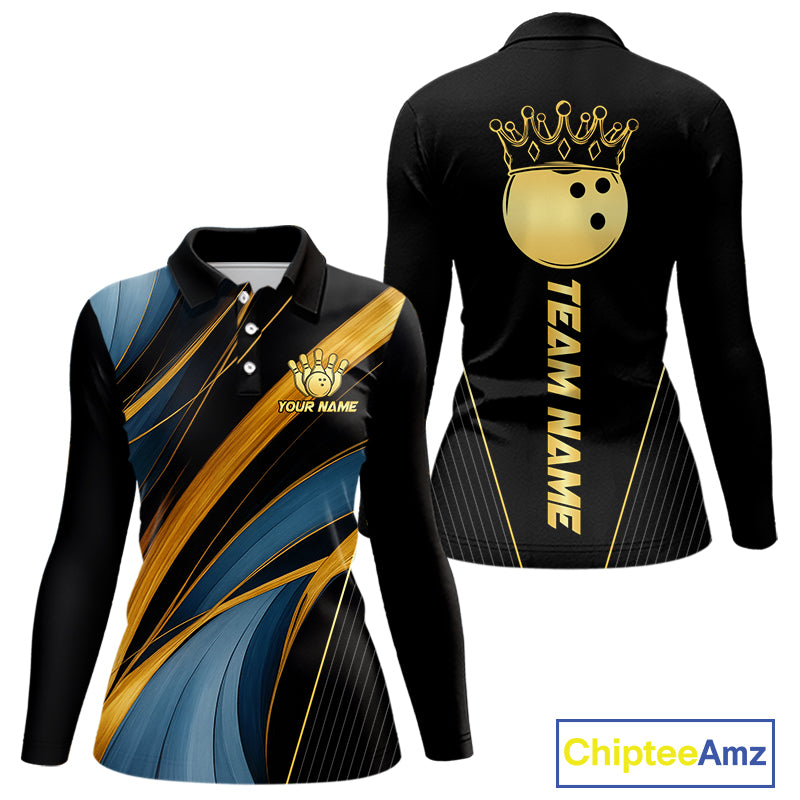 Blue & Gold Bowling ball Polo, Quarter Zip Shirts for Women Custom Bowling Outfit Team bowlers jersey NQS10032