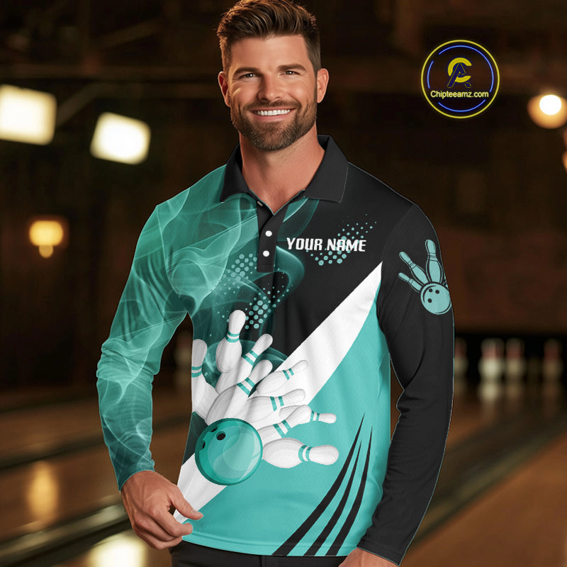 Mens bowling polo, 1/4 zip shirts Custom cyan blue smoke bowling team jerseys, gift for Bowlers NQS10060