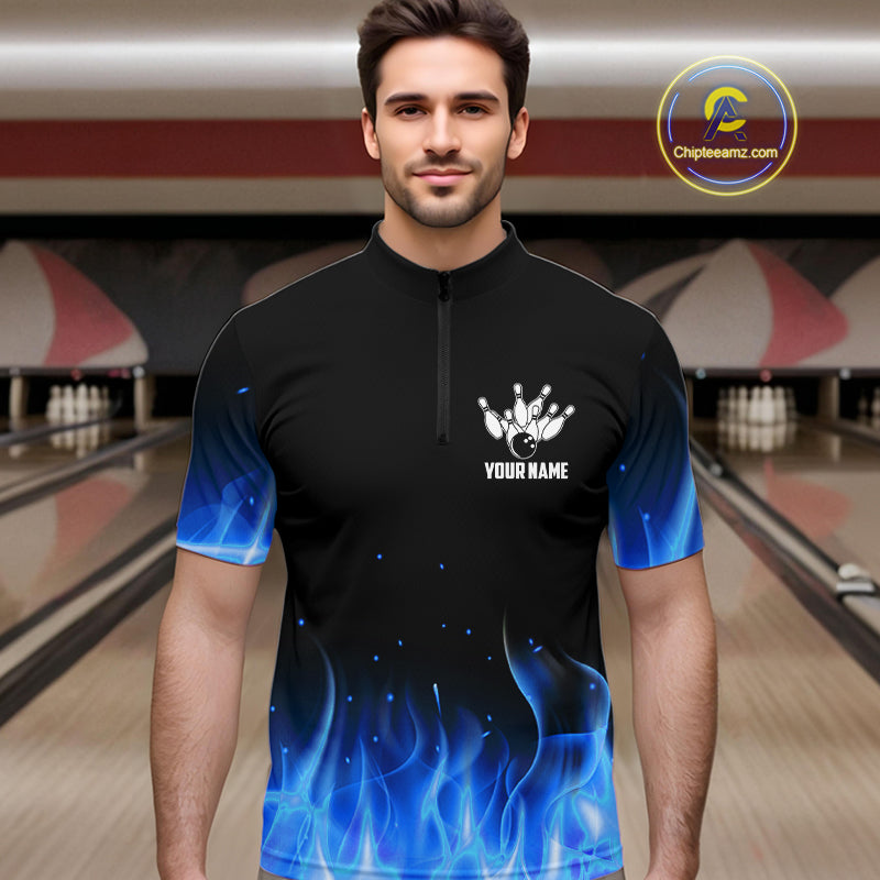Personalized Mens Bowling Shirt Blue flame Bowling Ball and Pins Team bowling jerseys for men Bowler NQS10471