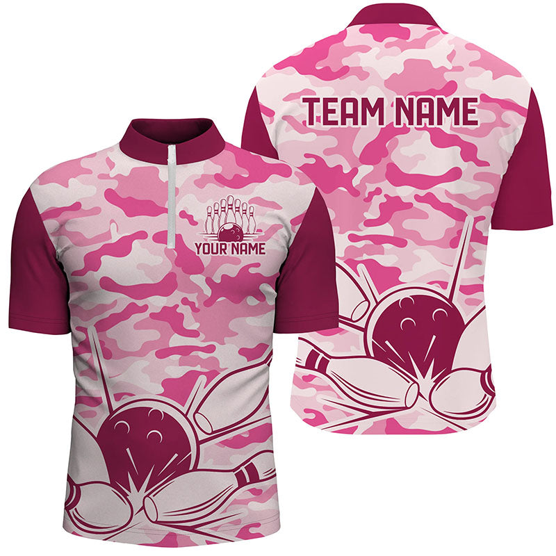 Pink Camo Bowling Polo, 1/4 Zip Shirts For Men Custom Bowling Team League Jerseys, Gift For Bowlers NQS8474
