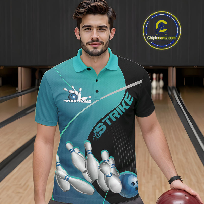Custom Black And Blue Strike Bowling Polo Shirts For Men, Bowler Outfit Team Jerseys IPHW9229