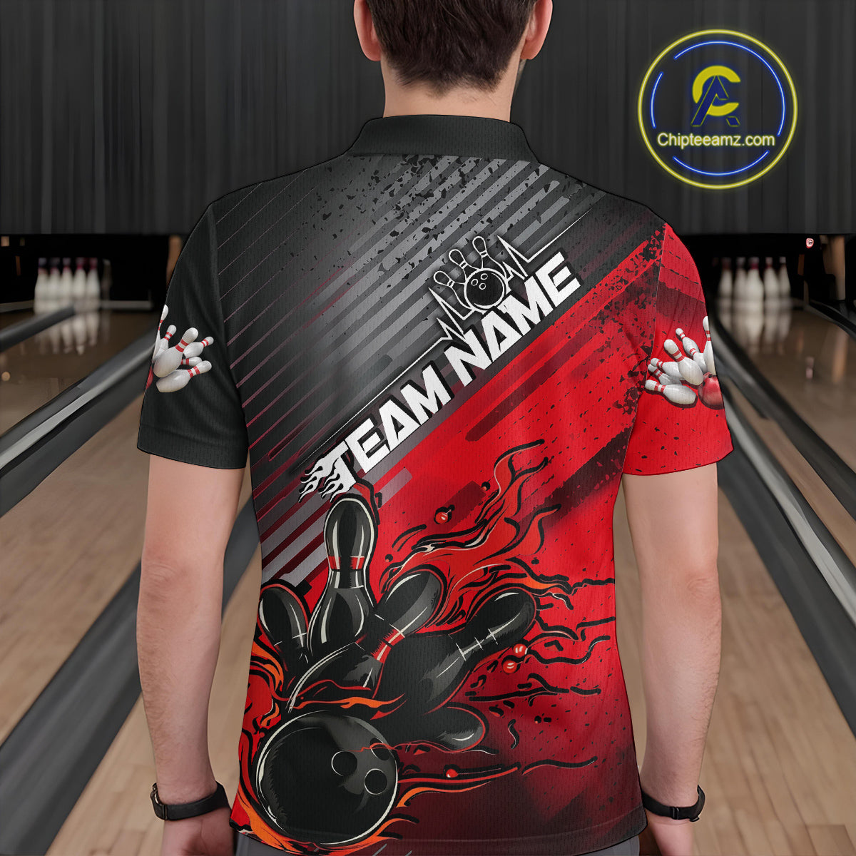 Custom Red Strike Flame Bowling Polo Shirts For Men, Bowling Team Shirt Bowlers Outift IPHW9615
