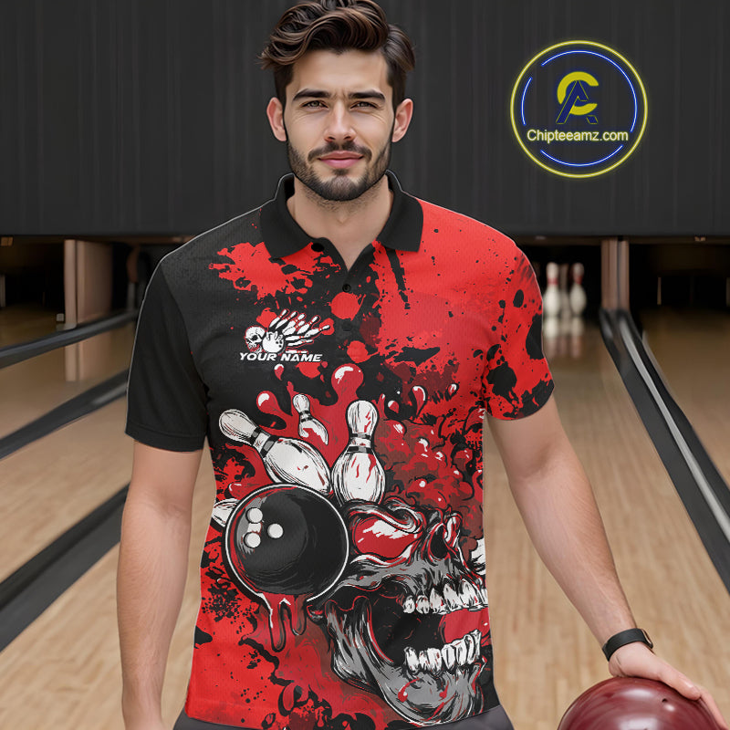 Custom Black And Red Splatter Skull Bowling Team Men Polo Shirt, Halloween Bowler Outfit IPHW9725