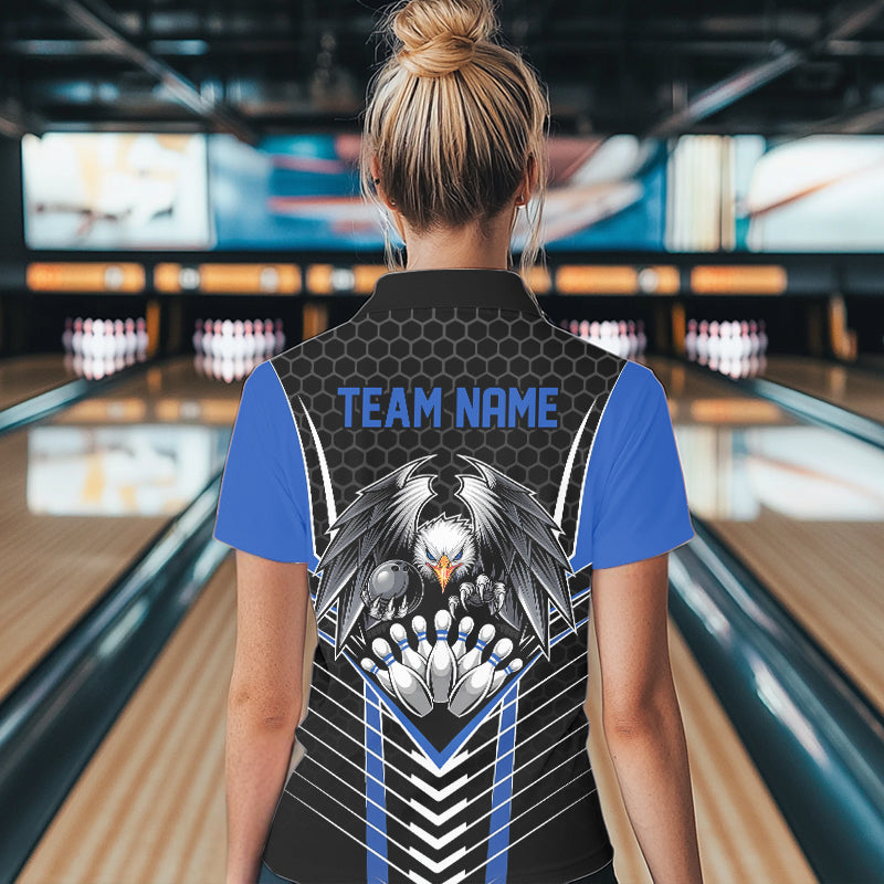 Custom Black And Blue Eagle Bowling Jerseys, Bowling Team Women Polo Shirts Bowlers Outfits IPHW8750