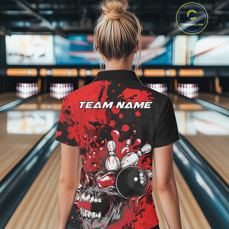 Custom Black And Red Splatter Skull Bowling Women Polo Shirt, Halloween Bowler Outfit IPHW9725