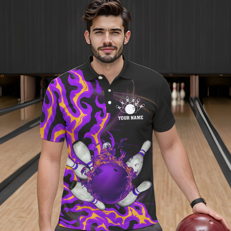Purple Flame Fire Bowling Polo, Quarter Zip Shirts For Men Custom Bowling Team Shirts, Gift For Bowler NQS9373