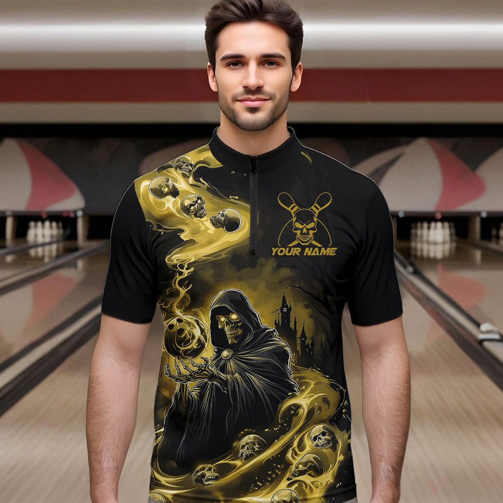 Black And Yellow Grim Reaper Custom Halloween Bowling Team Men Quarter-Zip Shirts, Bowlers Outfit IPHW8894