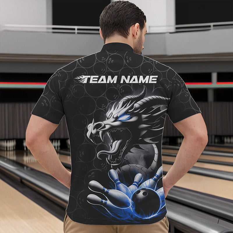 Custom Black And Blue Dragon Bowling Men Quarter-Zip Shirts, Bowling Pattern Dragon Bowler Outfit IPHW8918