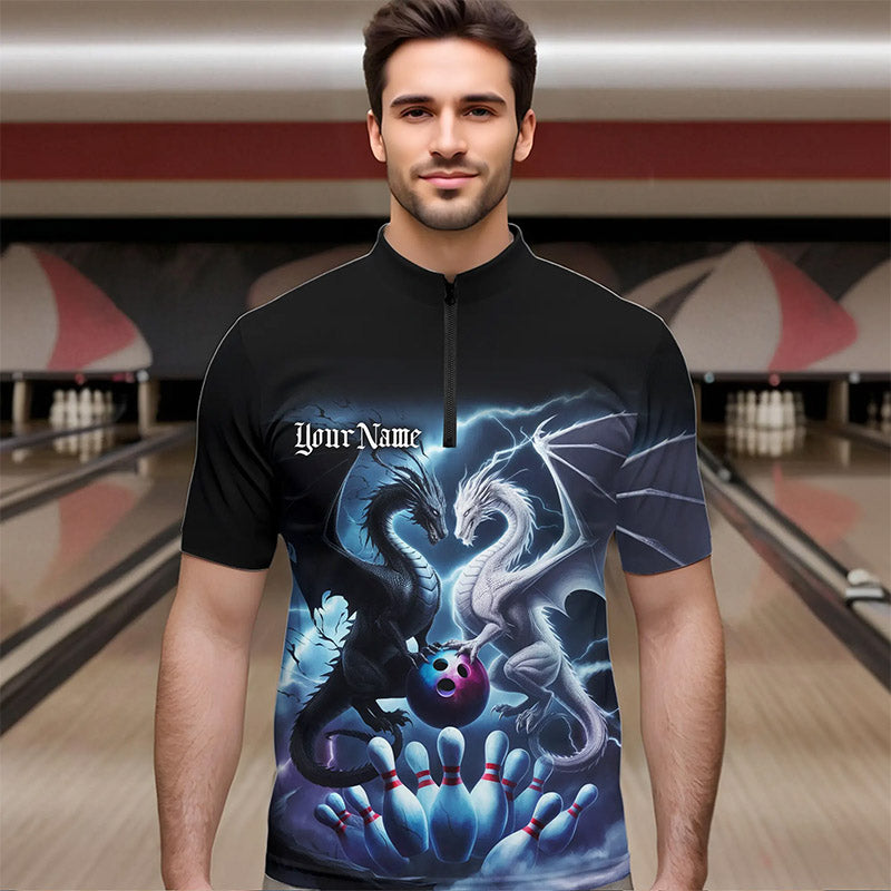 Custom Blue Lightning Black And White Dragons Bowling Quarter-Zip Shirts For Men Bowlers Outfit IPHW8957
