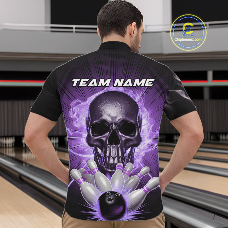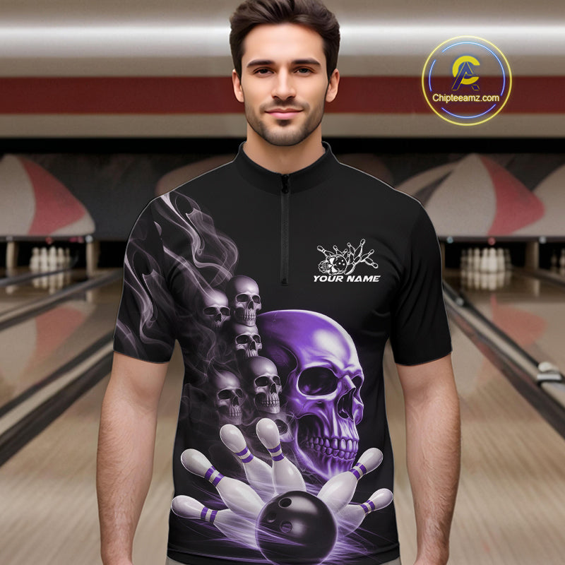 Custom Purple Glowing Ghostly Skull Bowling Quarter-Zip Shirts For Men, Halloween Bowlers Outfit IPHW9517