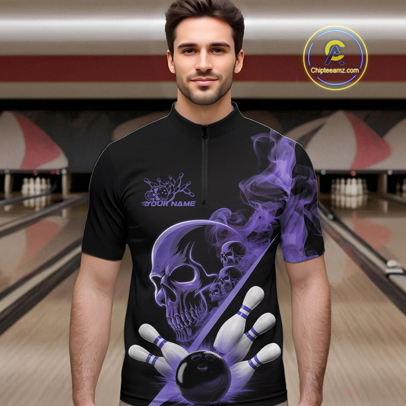 Custom Purple Smoke Skull Men Bowling Team Quarter-Zip Shirts, Hallowen Bowlers Jerseys IPHW9525