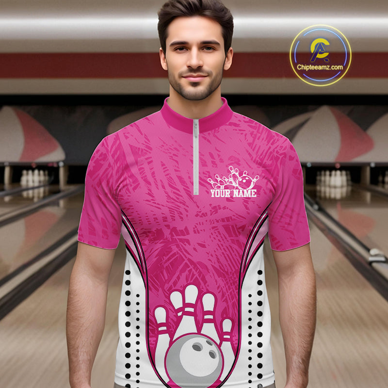 Custom Pink Camo Bowling Team Quarter-Zip Shirts For Men, Bowling Jerseys Bowler Outfit IPHW9596
