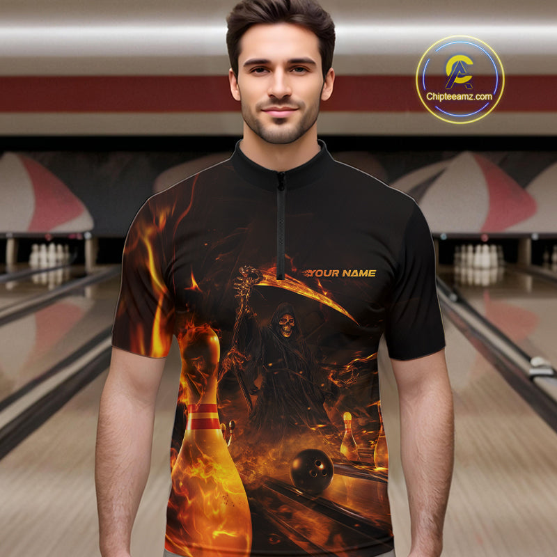Custom Fire Flame Grim Reaper Bowling Quarter-Zip Shirts For Men, Halloween Bowlers Outfit IPHW9711