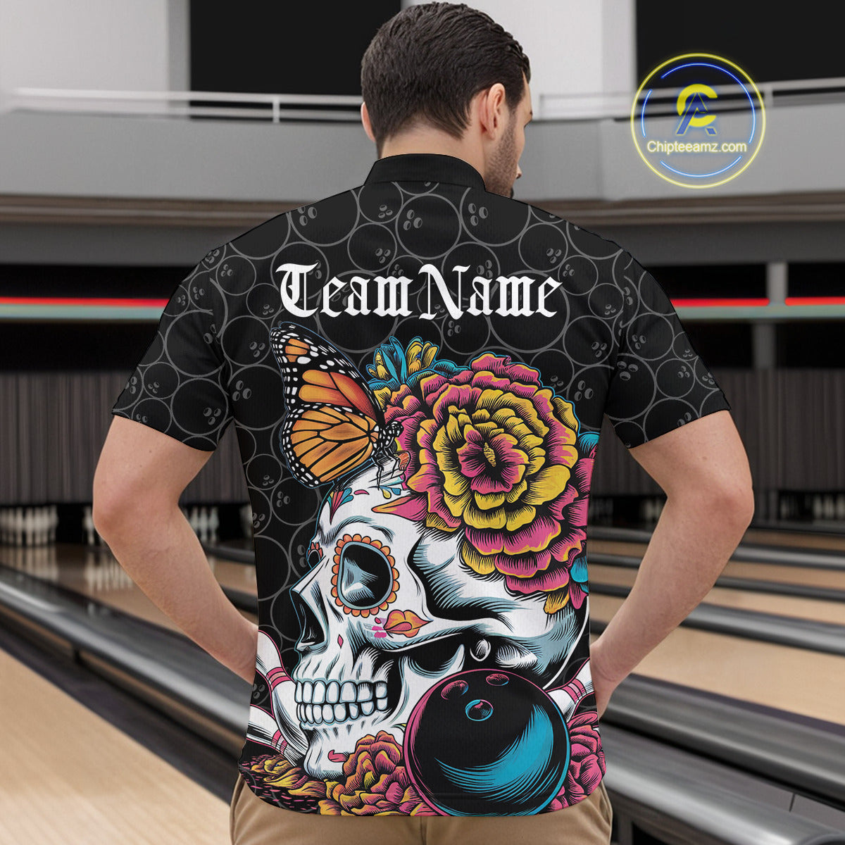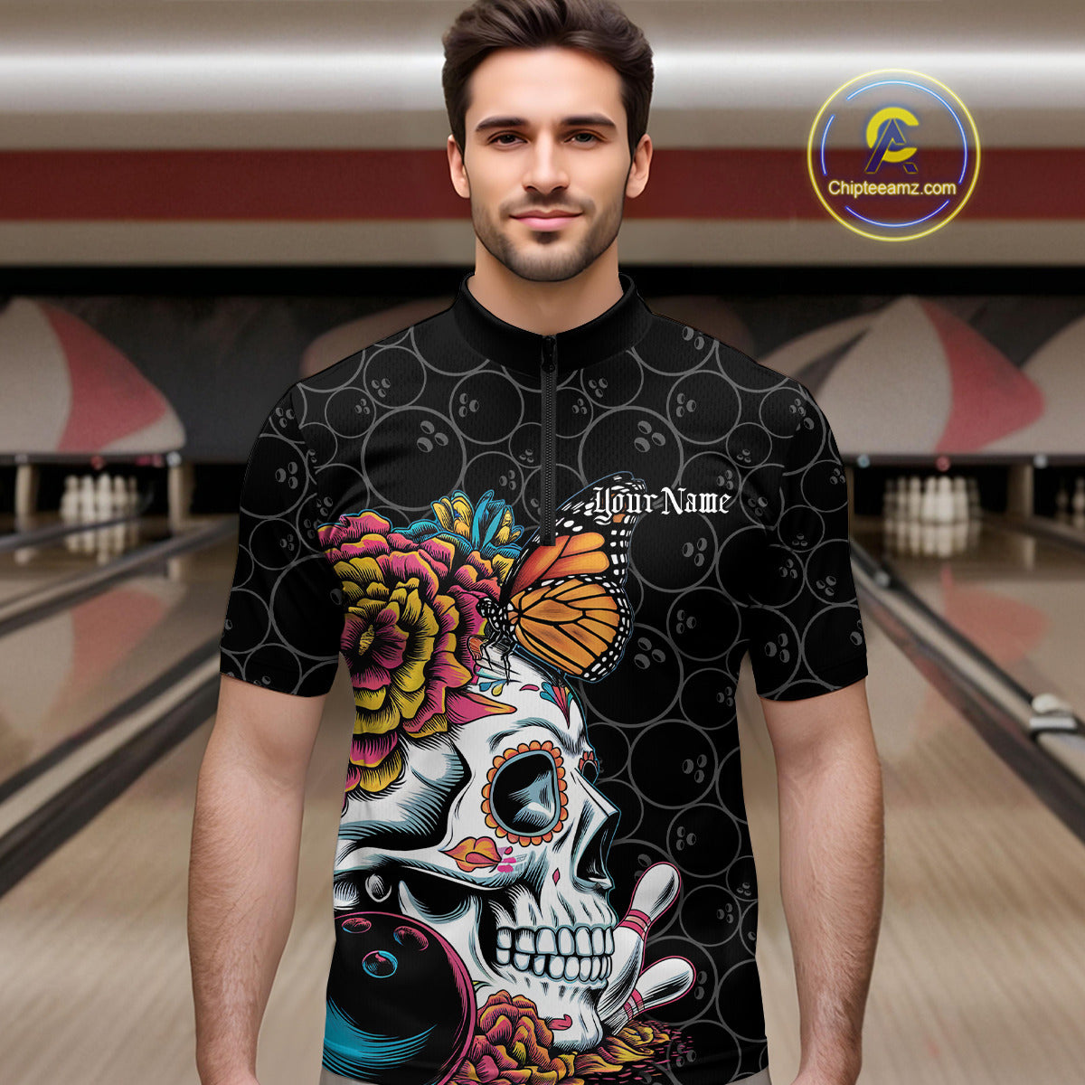 Custom Colorful Sugar Skull Bowling Team Quarter-Zip Shirts For Men, Halloween Bowler Outfit IPHW9751