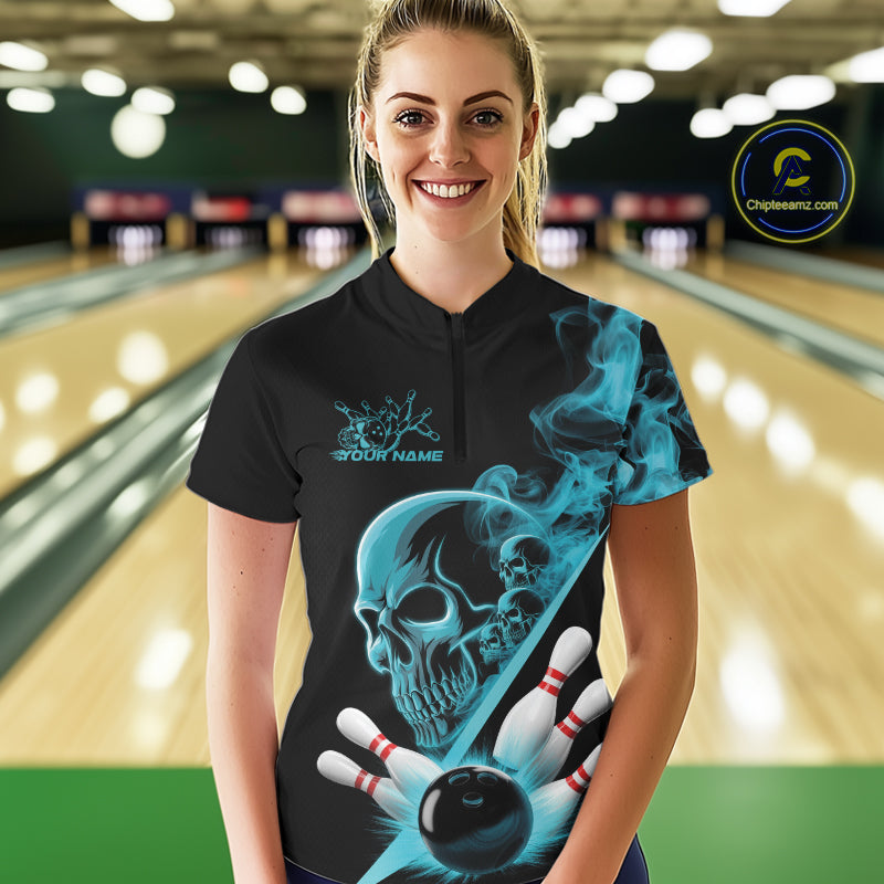 Custom Blue Smoke Skull Women Bowling Team Quarter-Zip Shirts, Hallowen Bowlers Jerseys IPHW9523