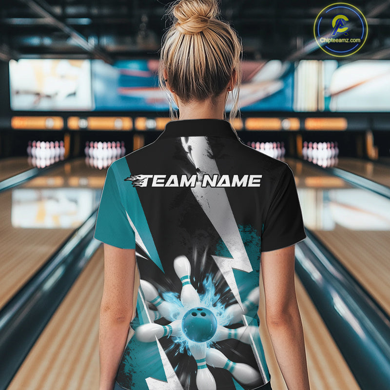 Custom Fiery Turquoise Blue Bowling Women Quarter-Zip Team Shirts, Flame Bowler Outfit IPHW9531