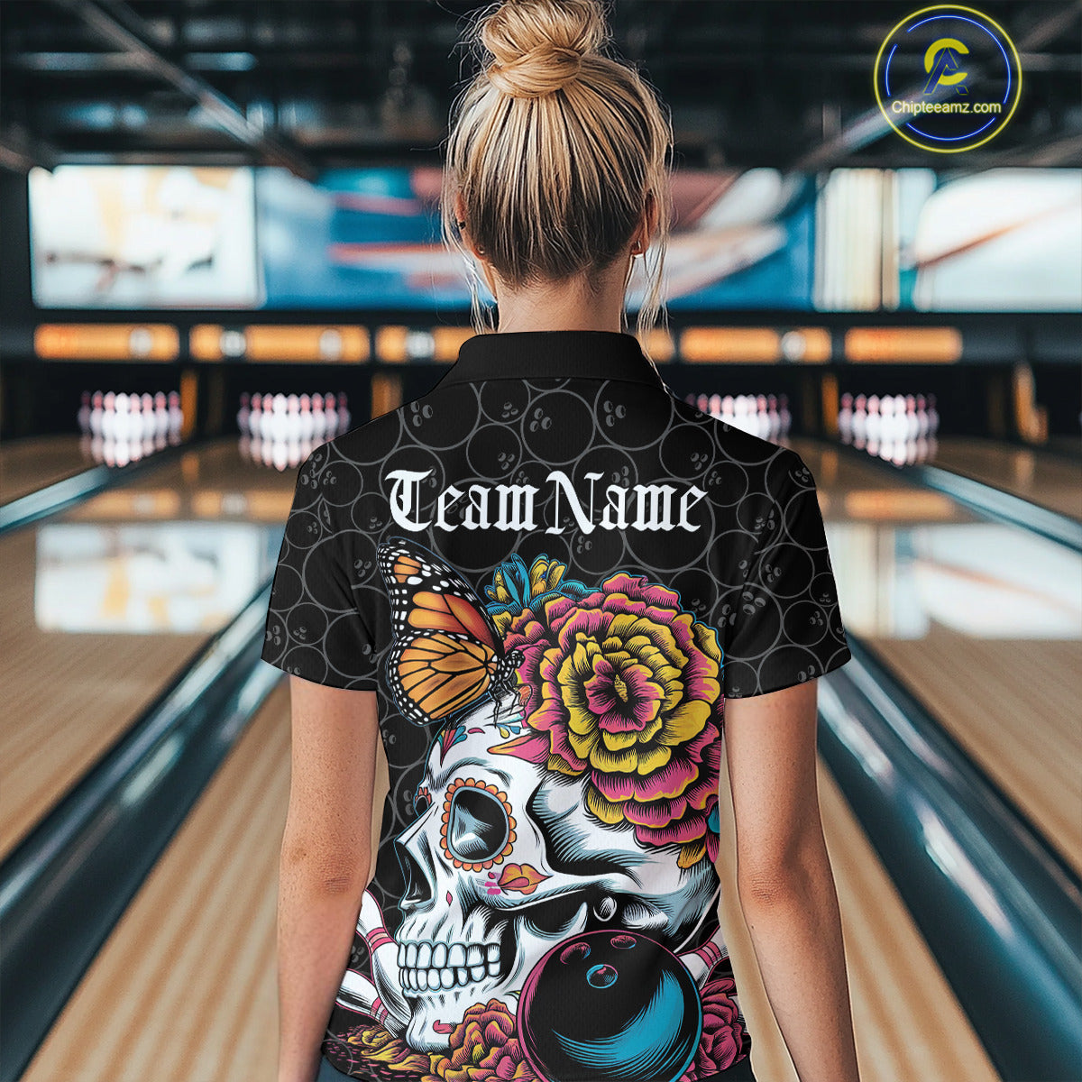 Custom Colorful Sugar Skull Bowling Team Women Quarter-Zip Shirt, Halloween Bowler Outfit IPHW9751