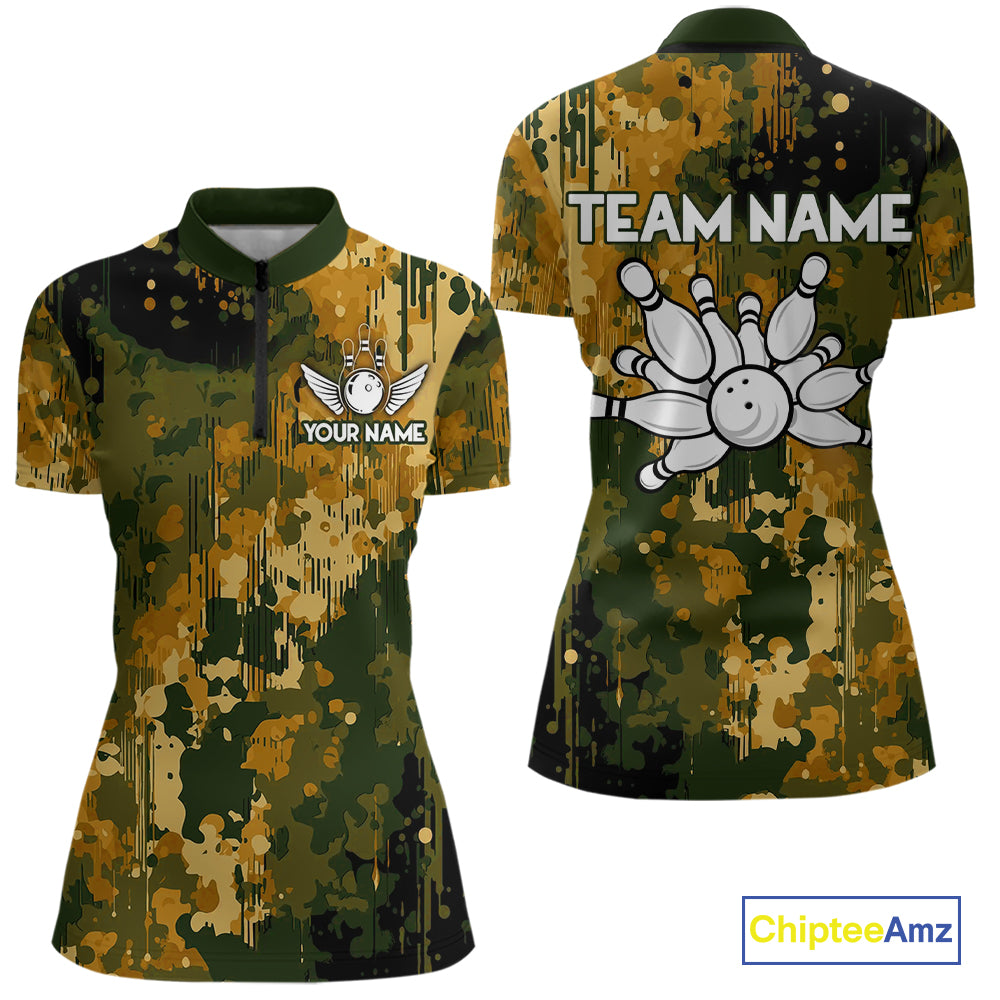 Yellow Camo Bowling Polo, Quarter Zip Shirts For Women Custom Bowling Team Jerseys, Gift For Bowlers NQS10456