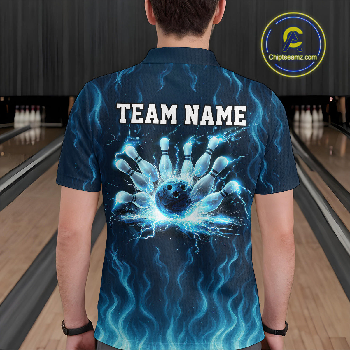 Blue flame lightning thunder Bowling polo, quarter zip shirts for men custom Bowling team jerseys NQS10387